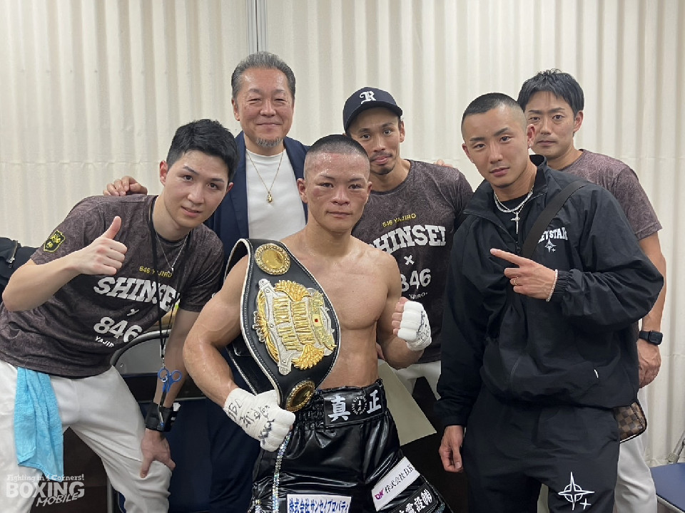 戴冠を喜ぶ山下正人会長やジムのメンバーと笑顔で記念写真に収まった友良だが、「強い眞下選手に勝って、ベルトを獲れたのはうれしいが、内容は全然ダメ。スタミナ面も鍛えて、今後の結果で見せたい」と自己評価は厳しかった。