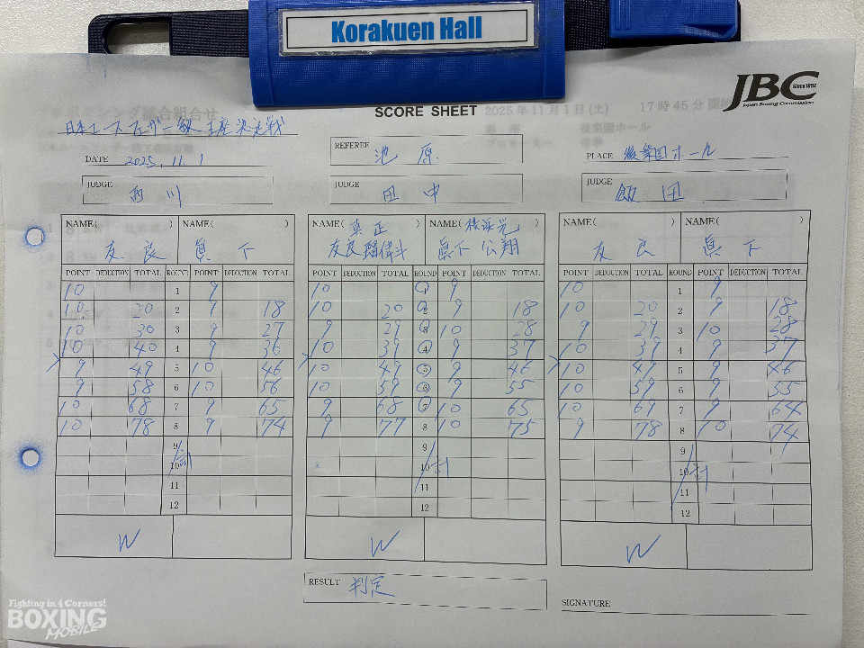 サウスポー同士による一戦は、友良は力強いジャブで先制すると、距離とブロックで回避してポイントを加点。中盤から後半にかけても、友良が右フック、左ストレートを好打。最終8回、眞下はプレスをかけて積極的な攻撃を仕掛けたが、逆転するまでには至らなかった。