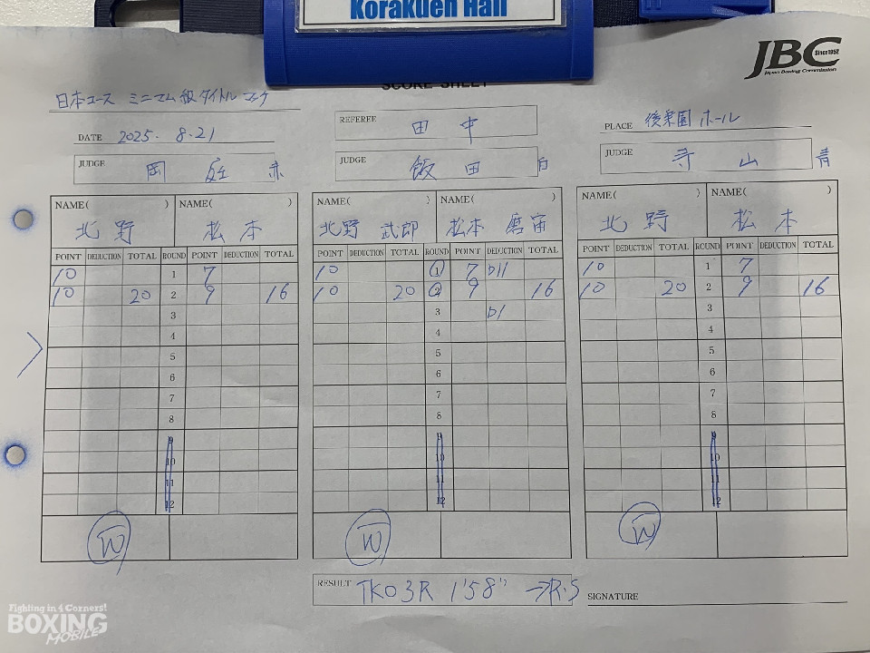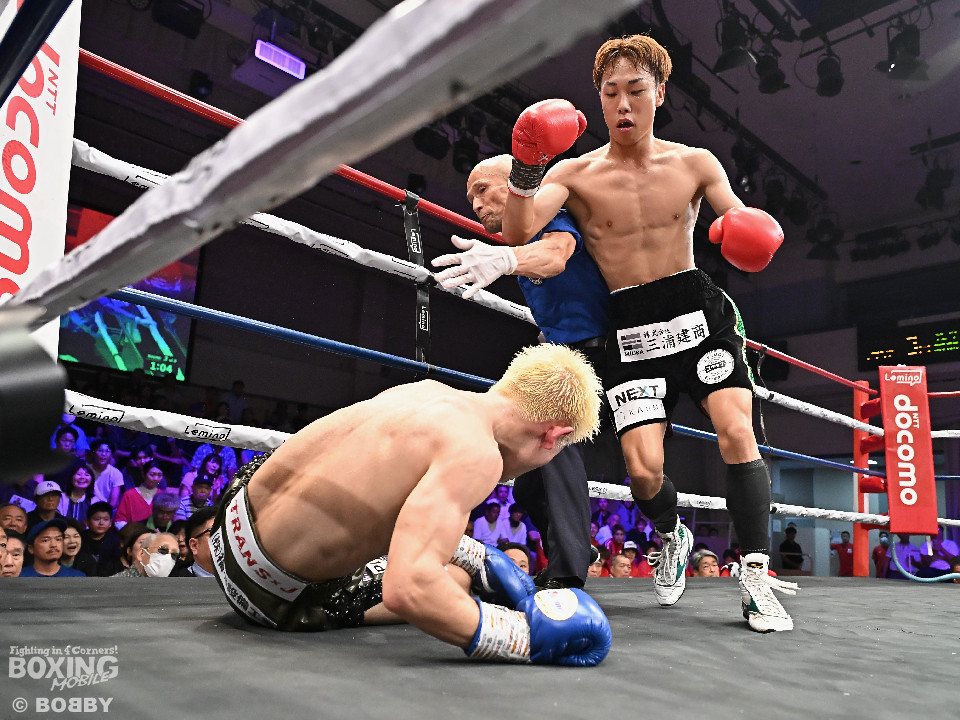 サウスポー同士による一戦は、北野がジャブを飛ばしてリズムを作ると、左オーバーハンドから追撃の左でダウンをゲット。再開後、左で再び松本を倒した。3回、北野は左右アッパーで効かせると、最後は右フックでダウンを奪い、決着をつけた。