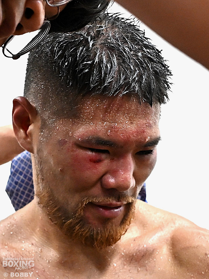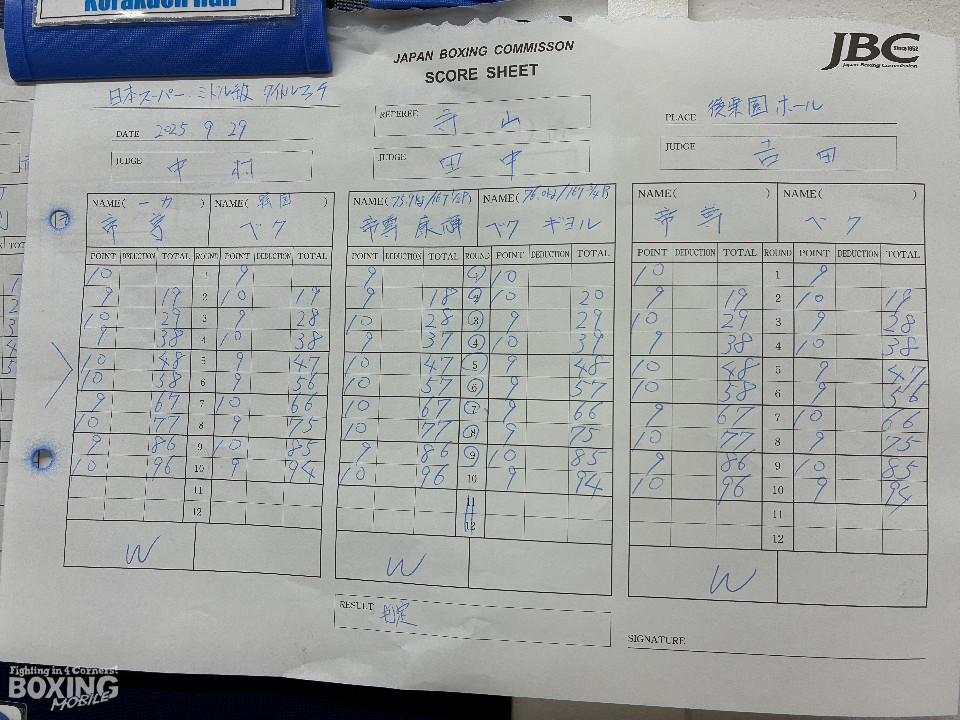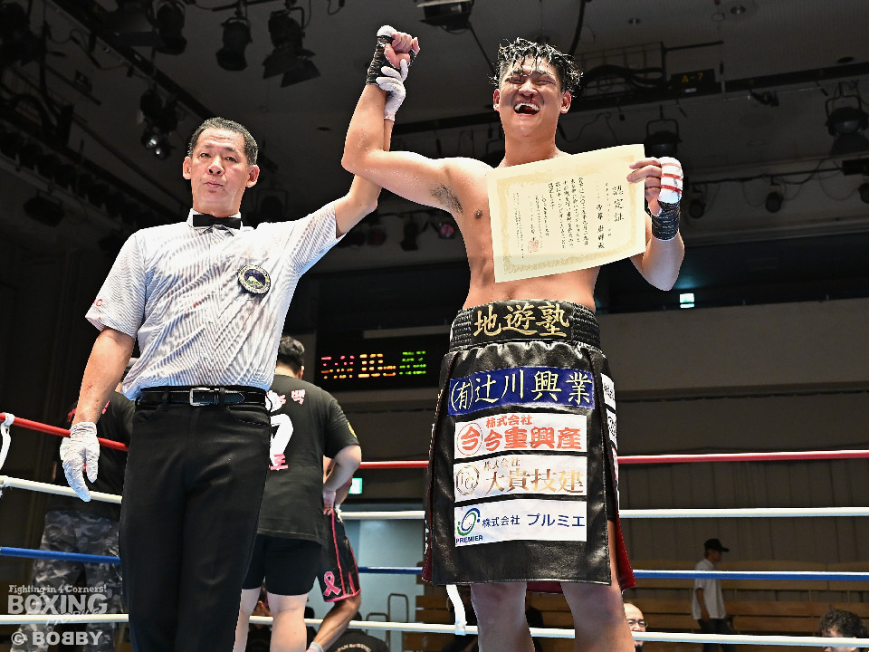 サウスポー帝尊が丁寧に左ボディストレートから仕掛けるのに対し、ベクは左フックで顔を弾き応戦。帝尊が左ボディアッパーを突き刺せば、ベクも気迫あふれるファイトで執念を見せた。前半終了時の公開採点は、48-47×2(帝尊)、48-47×1(ベク)と割れて、帝尊がリード。後半、帝尊は頭をぶつけてくる相手にも我慢強く左ボディを打ち込むと、8回には左フックでグラつかせて攻勢。最後まで強い気持ちで押し切った。
