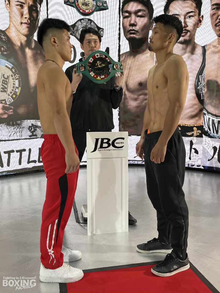 OPBF東洋太平洋ウェルター級タイトルマッチで対戦するチャンピオンの田中空(24=大橋)と挑戦者で、元日本同級王者の坂井祥紀(34=横浜光)が20日、東京・水道橋にあるドームシティ内blue-ing! DISCOVERで、前日計量に臨んだ。