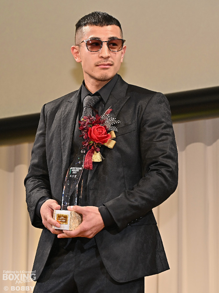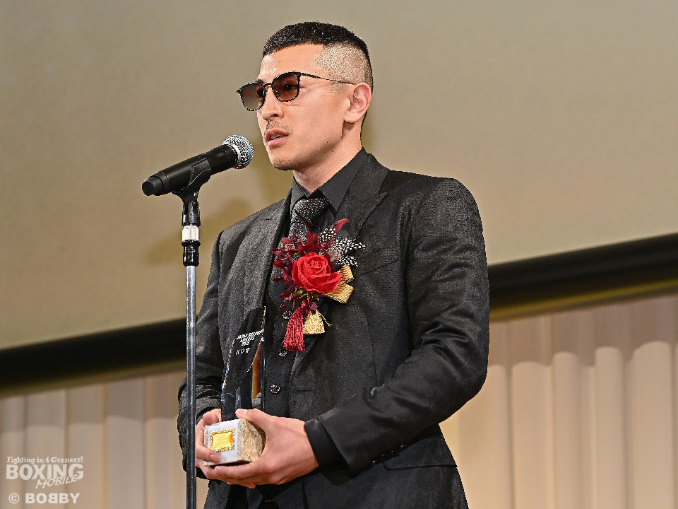 初のKO賞を受賞した矢吹は、「タフで一度もダウンしたことがない選手を倒せた。賞は何でもいただけたらうれしいので、特にこだわりはない。昨年は強い選手と激闘した1年だった」と振り返った。