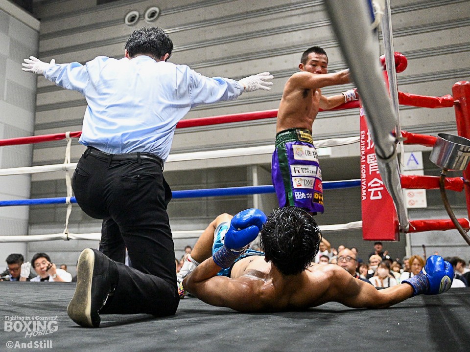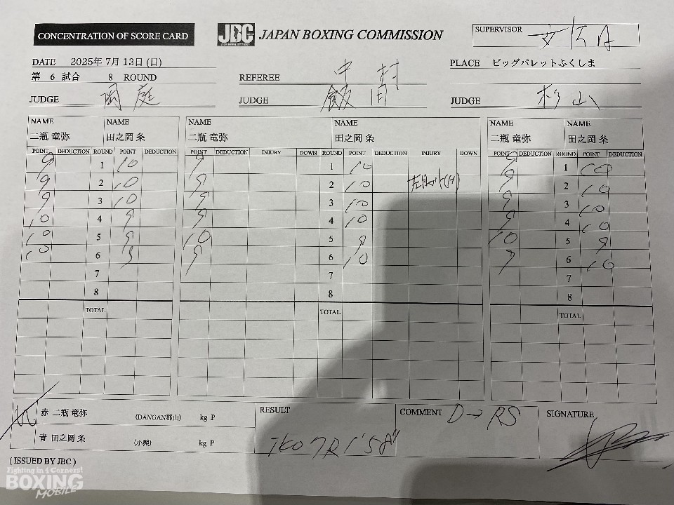 序盤はサウスポー田之岡が左ストレートを軸に冷静な試合運びでペースを掌握。プレスをかけた二瓶だが、右ストレートが決まらず。それでも二瓶はジリジリと距離を詰めてチャンスを伺うと7回に右ストレートでダウンを演出。目を抑えて倒れた田之岡を見てレフェリーがストップした。ポイントで劣勢の二瓶が逆転勝ちした。