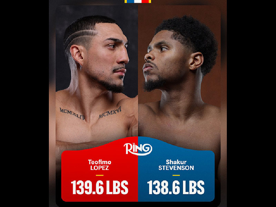 スーパーライト級リミット63.5kgを王者ロペスは200g少ない63.3kgでパス。対する挑戦者スティーブンソンは600gアンダーの62.9kgで秤を降りた。