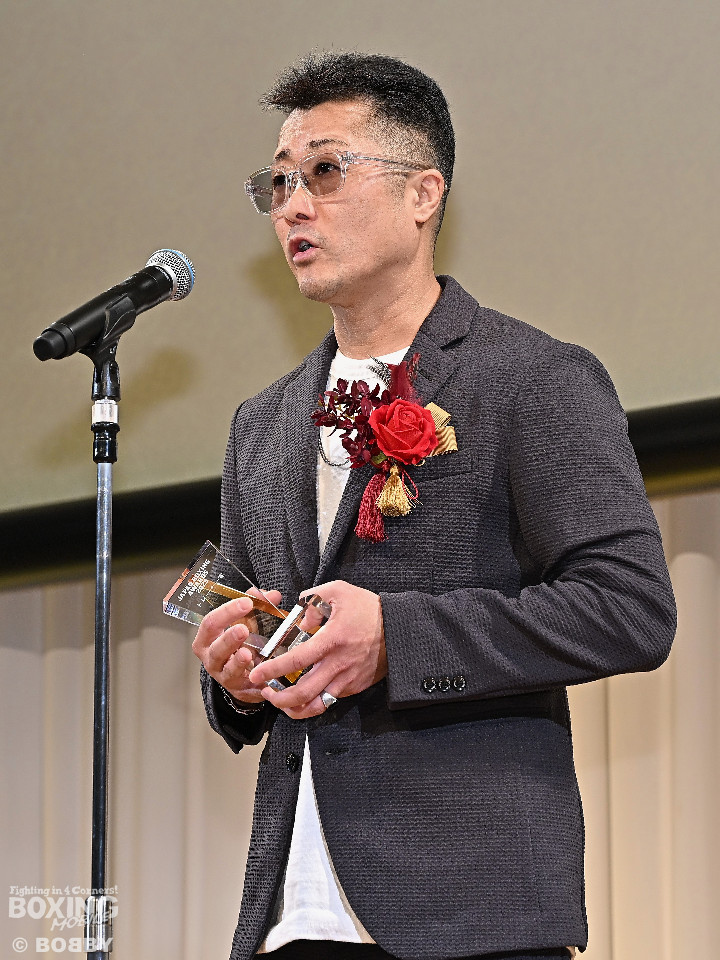 この日は特別賞と功労賞も発表された。特別賞受賞者を代表して登壇した木村翔氏は、「僕は15歳でボクシングに出会って、ボクシングというスポーツに人生を変えてもらった。昨年11月に地元・埼玉県熊谷市にジム(B Mind)をオープンしてプロ加盟しました。今後は少しでもボクシングを盛り上げられるよう日々、精進していきたい」と語った。