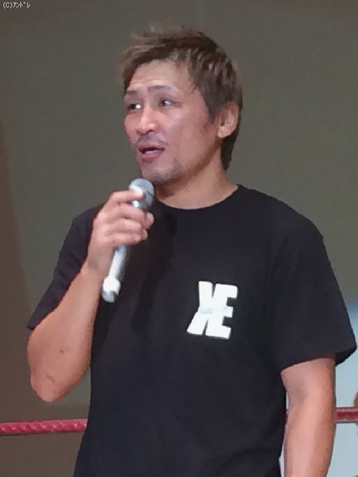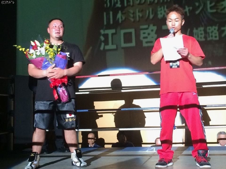挨拶に立った江口氏は「九州から裸一貫出て来て14年、本当に何度九州に帰ろうかと思ったかわかりません。でも強い気持ちを持ってチャンピオンになれました。本当にありがとうございました」と感謝を述べ、「これからも強い選手を育てて行きますので応援よろしくお願いします」と客席に向け深々と頭を下げた。