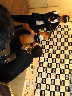 今月8日に行われるWBA世界スーパーフライ級タイトルマッチに先立って、6日、予備検診がホテル日航大阪で行われた。マスク姿で現れたチャンピオン名城信男(六島)、挑戦者ウーゴ・カサレス(メキシコ)共に異常なしと診断された。(担当医師:多根一之 コミッションドクター)