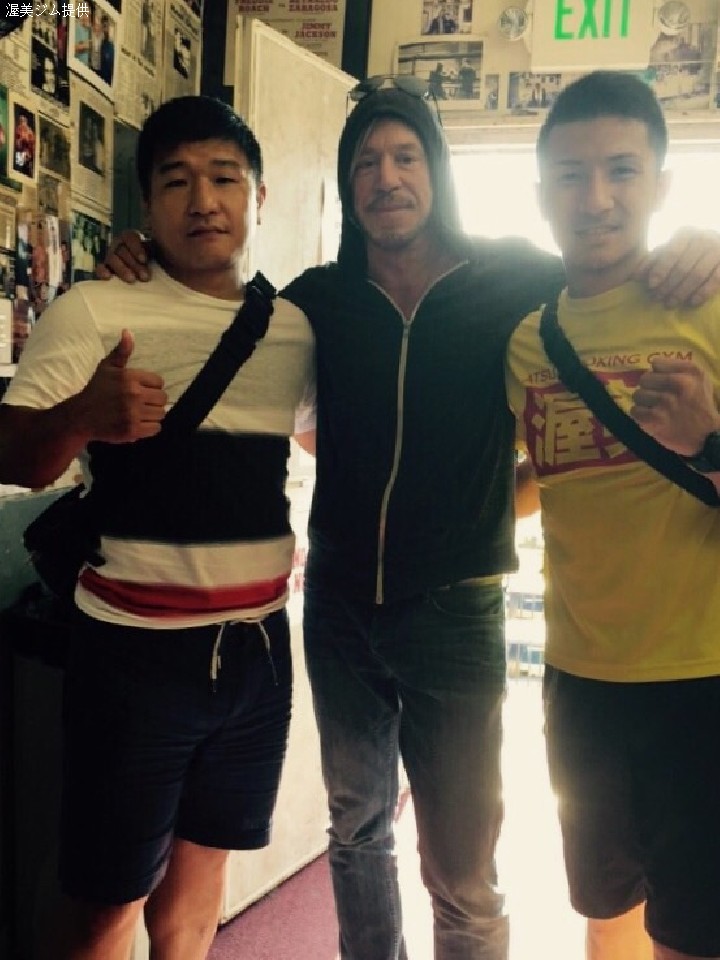 合宿に同行している大東旭会長代行は「初日からミゲル・バスケスの若きスパーリングパートナーや現地メキシカンボクサー達とのスパーリング三昧に充実してます。私の現役時にL.A.ジムでスパーリングをしてたアントニオ・マルガリートのトレーナーが偶然にもミゲル・バスケスのトレーナーで感激の再会。勿論、バスケスとのスパーリングを約束しました。ワイルドカードジムにも出入りしてて、フレディ・ローチに歓迎され、突如ミッキーロークと対面、金子戦はオーバヒート寸前でリングに上がります、宜しくです‼」と米国キャンプの充実ぶりを伝えた。