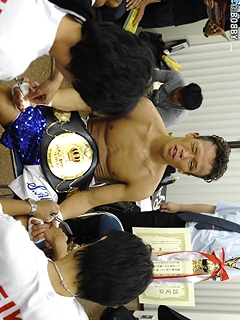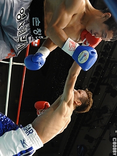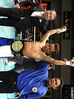 負傷判定ながら、5Rまで左ストレートで試合を支配した"SUGER"下田昭文。世界挑戦の階段を確実に一歩前進させた。