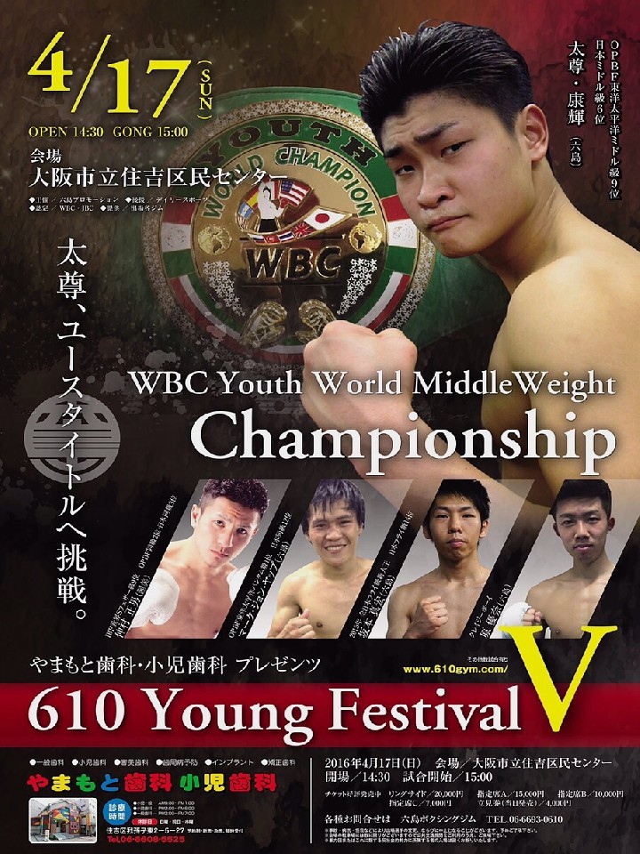 OPBF東洋太平洋ミドル級9位、日本同級6位の太尊康輝(23=六島)が、4月17日(日)の大阪・住吉区民センターでWBC世界ユースミドル級王座決定10回戦に出場することが分かった。対戦相手は未定。
