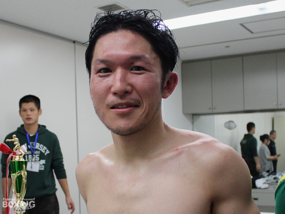 5ラウンドに右拳を痛めた板垣は患部を冷やしながら会見に応じた。「接近すると向こうに分があると思ったので、4ラウンドまではヒット&アウェーでいき、途中から左アッパーを出していく作戦だった。前回の試合で右肩を痛めたのでその間、左を中心に練習したのが功を奏した。相手は調整ミスで体調が