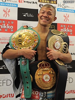 子供の頃から世界3階級制覇を口にしていた興毅は、3本の世界ベルトを前に「言葉が無い。ムニョスはパンチもあり、スタミナもある強い相手だった。階級を上げ、それに耐えられる力を自分もつけた。良い経験が出来ました」と、会心の笑顔を見せた。