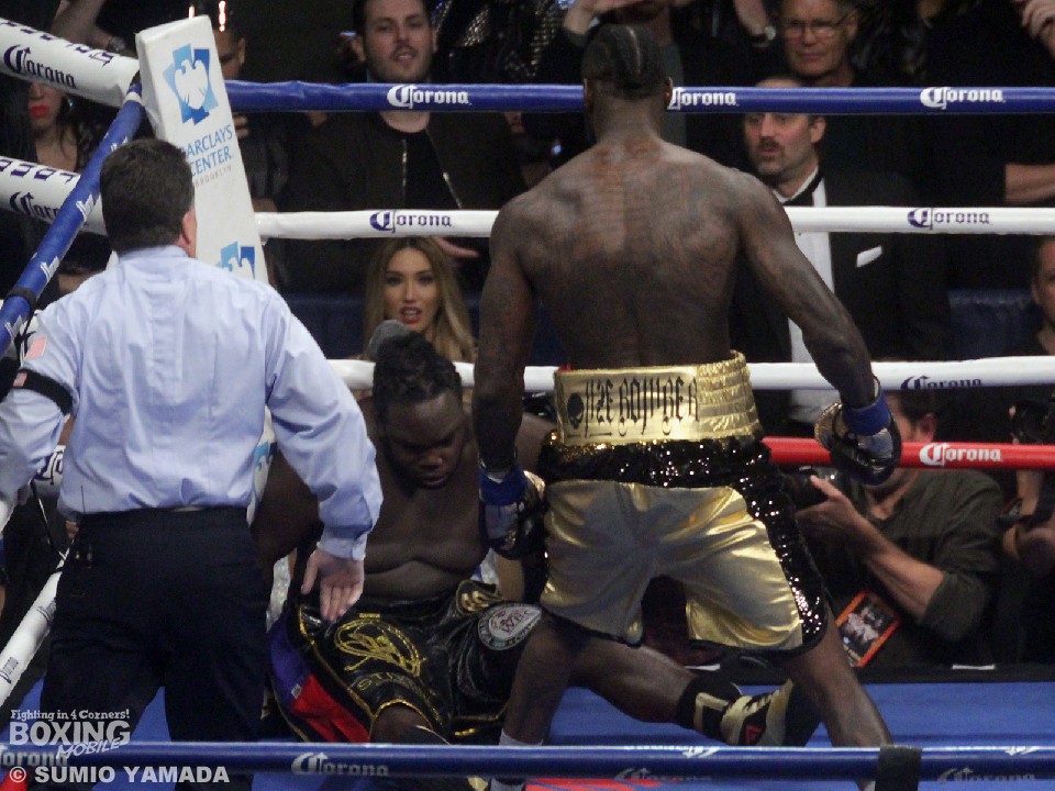 唯一倒せなかったスティバーンを迎え6度目の防衛戦に臨んだワイルダーが、まずはスタンスを広く取り遠くから力強いジャブであおった。1年10ヵ月前にワイルダーにベルトを奪われたスティバーンはガードを固め様子を窺うが、2分過ぎにガードを突き破る右ストレートが入りダウン。立ち上がるが、直後に豪快なパンチを叩きつけられ、2度目のダウン。ここも辛うじて起き上がったが、最後は左右をまとめられ、どうすることもできずに崩れ落ちた。ワイルダーが圧巻の初回KO劇で、前王者を返り討ちにした。ワイルダーは39戦全勝(38KO)。スティバーンは29戦25勝(21KO)3敗1分。