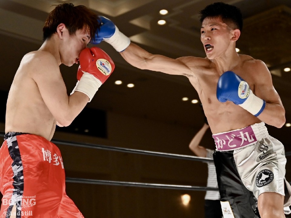 第4試合、54.5s契約4回戦では、荒木広大(23=畠山)と左田浩太(22=博多協栄)が拳を交えた。開始から荒木がプレスをかけて、積極的な攻撃を展開。2回に右フック、左ボディを効かせて、最後は左フックで豪快に倒した。