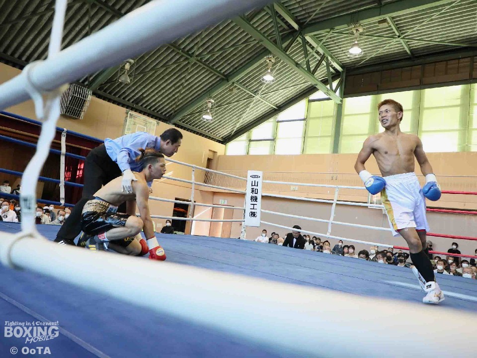 開始から右ストレートを好打した小山が先手を奪って倒しにいくも、ここを耐えた高松が、右オーバーハンドをジャストミートさせて逆転。そのままペースを渡さず、2回には同じ右オーバーハンドで、ダウンを追加した。懸命に打ち合った小山だが、ロープ際で崩れ落ちたところで、レフェリーが試合を止めた。