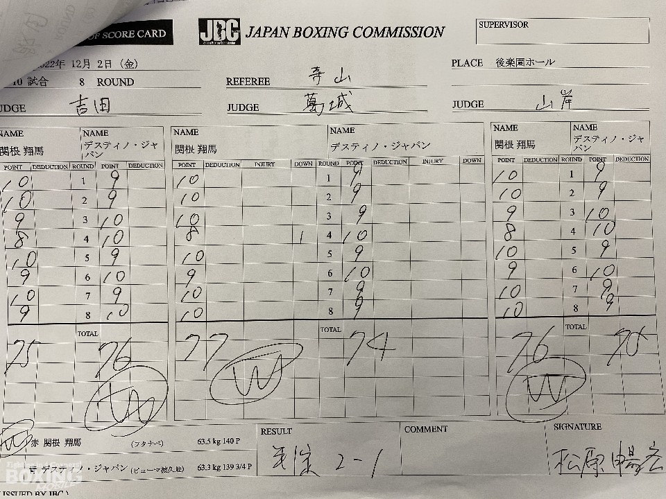 関根がプレスをかけて、右ボディストレートを好打。積極的な攻撃で序盤戦を制した。デスティノは、3回から反撃に転じると、4回に左フックから連打でダウンを演出。しかし、関根はグイグイと前に出て、ボディにパンチを集めて攻勢をかけた。デスティノはジャブで突き放し、ポイントを挽回。最終8回、関根は左フックで顔を弾き、ジャッジに攻勢をアピールした。ジャッジは割れたが、関根に軍配が上がった。
