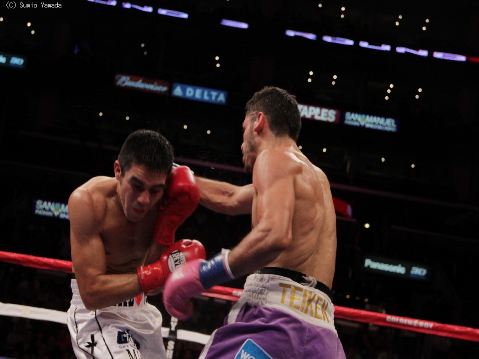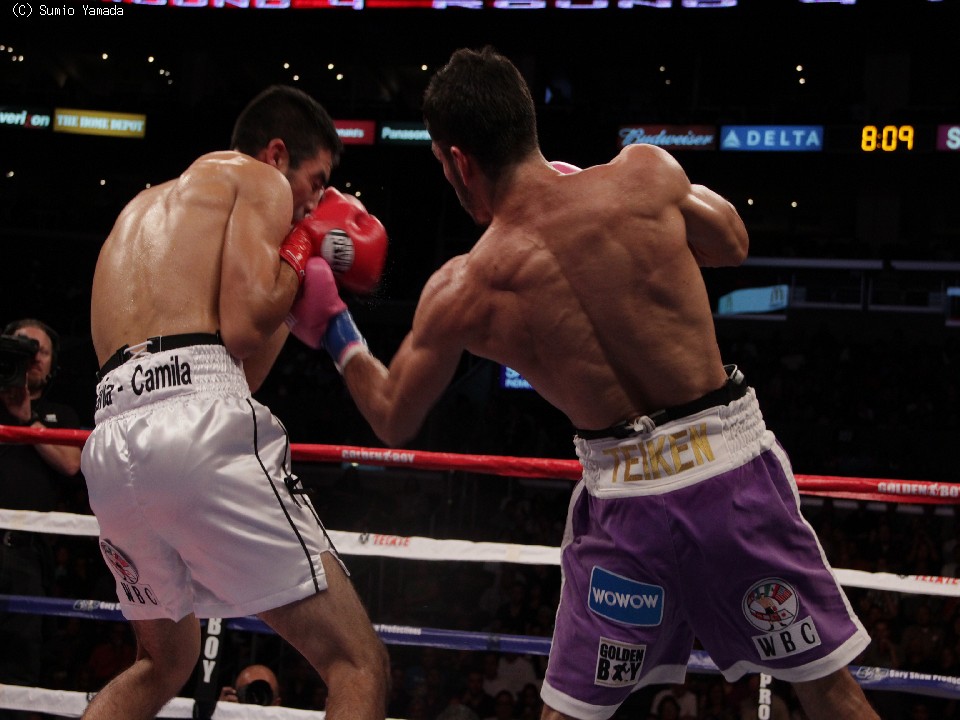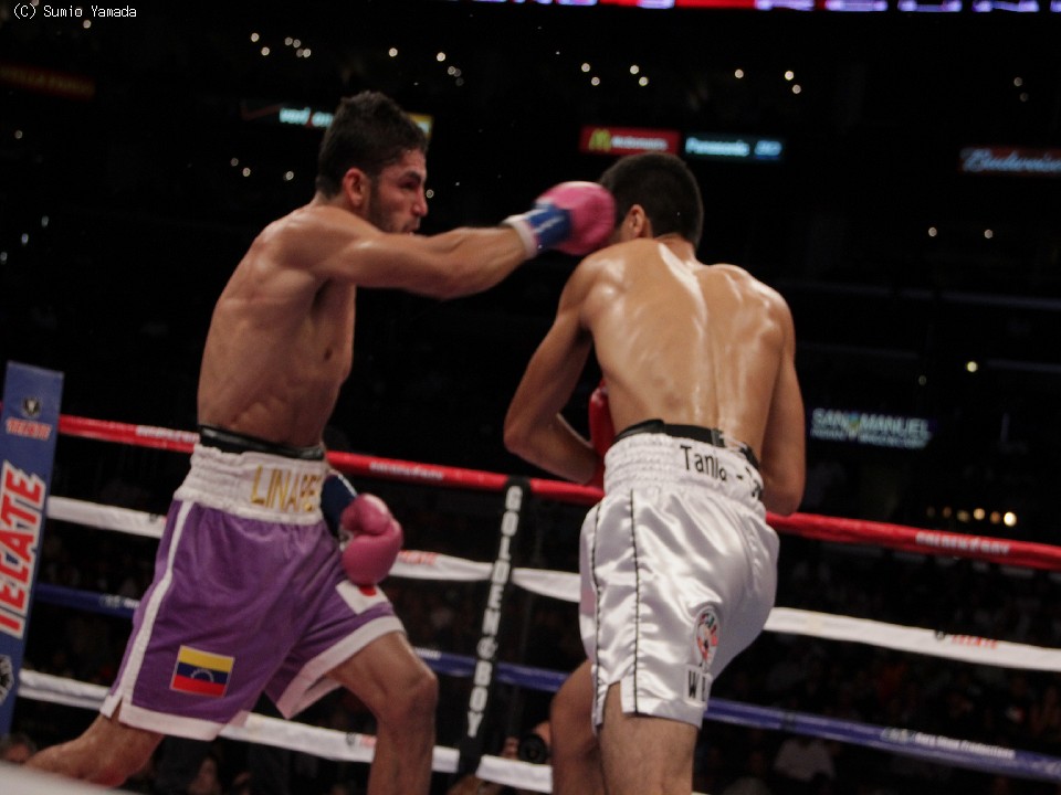 9対2のオッズが示したとおりリナレスは序盤から快調に飛ばした。懐の深いサウスポーのデマルコをスピードで圧倒、ダメージを与えることはできなかったものの毎回のようにポイントを積み重ねていった。気になることといえば途中で鼻梁と右目上をカットして流血に悩まされたことぐらいだった。