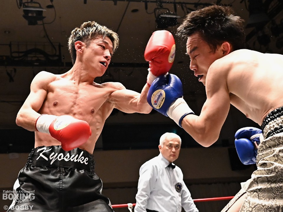第10試合スーパーバンタム級4回戦では、本間京介(25=Reason押上)と紺野大(33=新日本木村)が対戦。左右に動きながら揺さぶりをかける紺野に対し、本間はワンツー、左ボディで対抗。2回、本間はワンツーでダウンを奪うと、回転力を活かした連打で攻め立てた。