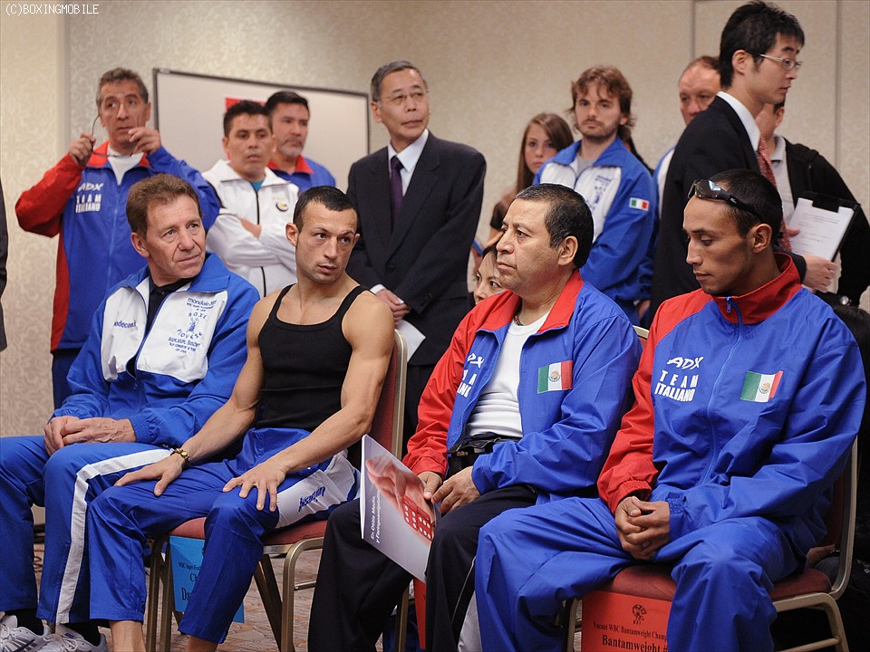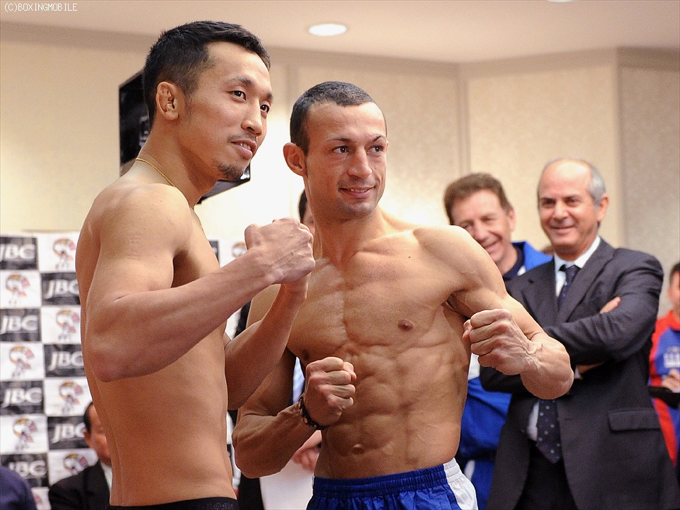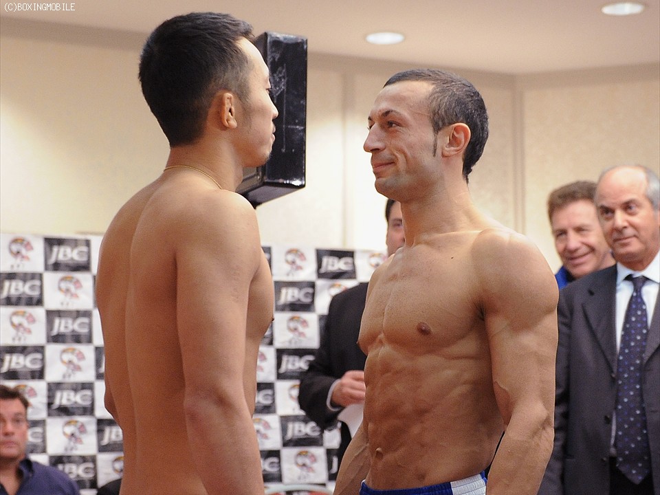 いよいよ明日6日に迫った、代々木競技場第二体育館で開催される「ワールドプレミアムボクシングThe REAL」のメインイベントを締めるWBC世界スーパーフェザー級タイトルマッチ、王者"Genius"粟生隆寛(帝拳)VS挑戦者"イタリアの伊達男"デビス・ボスキエロの公開計量が5日、都内で執り行われた。