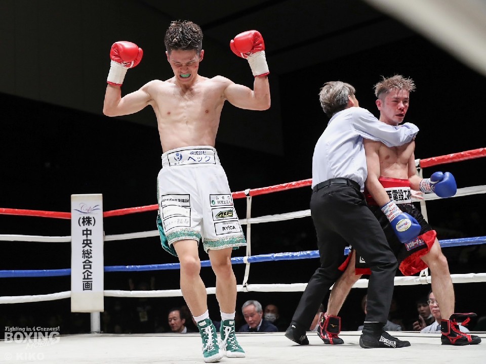 序盤は先に仕掛けた今川が、重心を落としてノーモーションの左ストレートでリズムを作ったが、古谷は冷静にジャブを突いて、右アッパーを加えてプレスをかけ返すと、5回に右を当てて一気に詰めて、ダウンを奪った。立ち上がった今川だが、勝負に出た古谷がパンチをまとめると、レフェリーが試合を止めた。