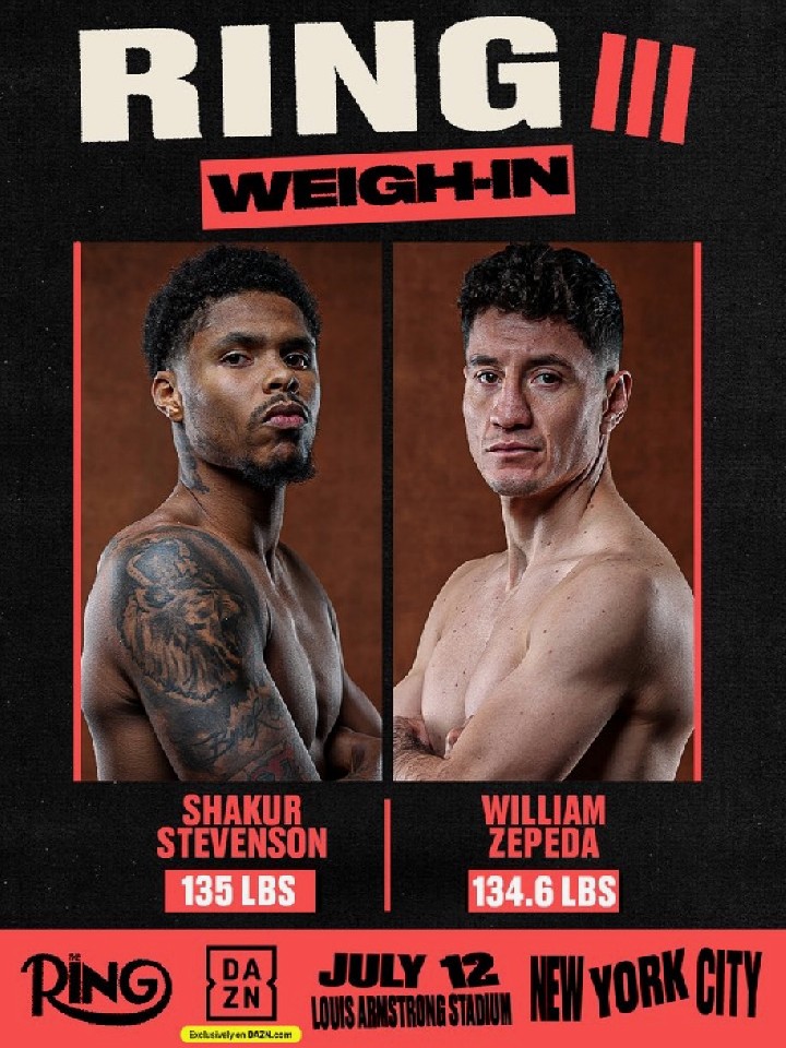メインイベントは、WBC世界ライト級王座統一戦。計量を135.0lbでクリアした正規王者のシャクール・スティーブンソン(28=米国)と、134.6lbでクリアした暫定王者のウィリアム・セパダ(29=メキシコ)が対決する。