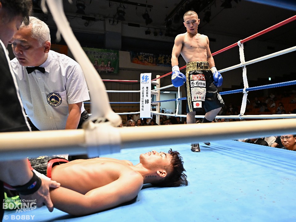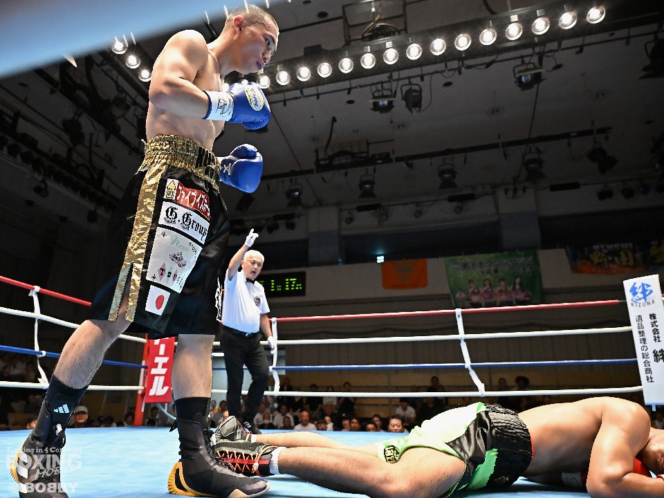 稲元が開始早々、右ボディストレートでダウンをゲット。再開後、相手の攻撃をブロックし、左フックで豪快に倒した。