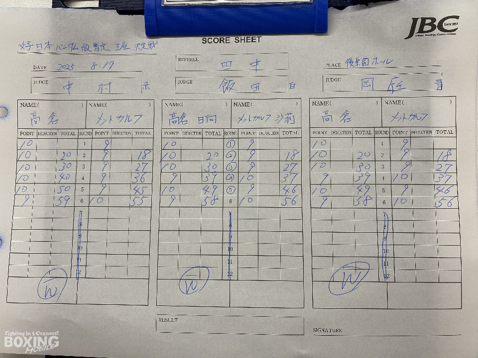 初回からメットカルフが仕掛けて激しい打撃戦を展開。高倉は真っ向から打ち合うと、ジャブからワンツー、左アッパーを好打。5回、高倉は打ったら動くを意識して、ジャッジに攻勢をアピールした。終始、有効打で上回った高倉が日本女子暫定王者に輝いた。