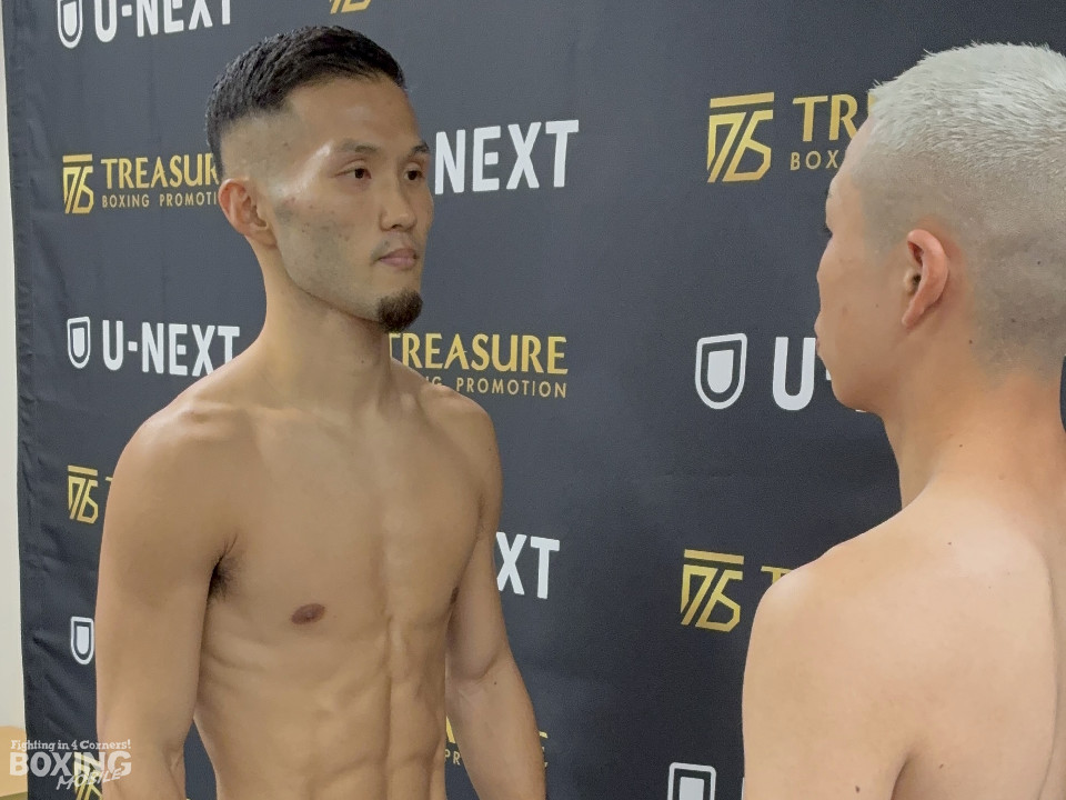 スーパーバンタム級リミットを100g下回る55.2sでクリアした池側は、「相手とは何度もスパーリングをしていて、手の内は知り尽くしている。前に出てくるので自分の戦略次第で流れが決まる。距離を取っても打ち合ってもいいように準備してきた」と攻略に自信を見せた。