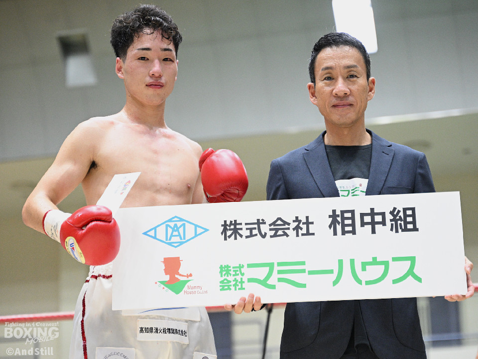 お隣の高知県から遠征してきた山川倖平(22=黒潮)は、勝利者インタビューで「始まってみたら、あっという間。トレーナーとやってきたことを出し切った。もっと殴られずできた。来年は全日本新人王を目指して頑張ります」と、来年の飛躍を誓った。
