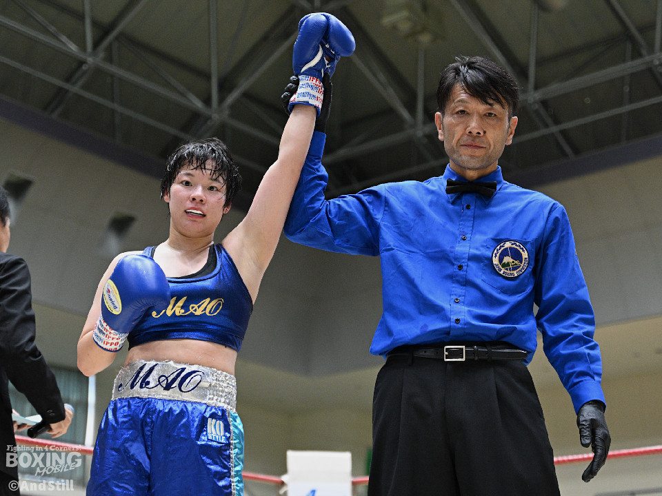 約50人からなる円陣を組んで出撃した鎌田真央は試合後、リング上のフラッシュインタビューで「とっても疲れました。負けられないプレッシャーを感じながら、練習してました。会長に教えてもらったことをイメージしながら練習してきました。12月も試合をするんですけど、しっかり勝って、ゆくゆくはタイトルに挑戦したいです」と、地元の声援に笑顔で答えた。