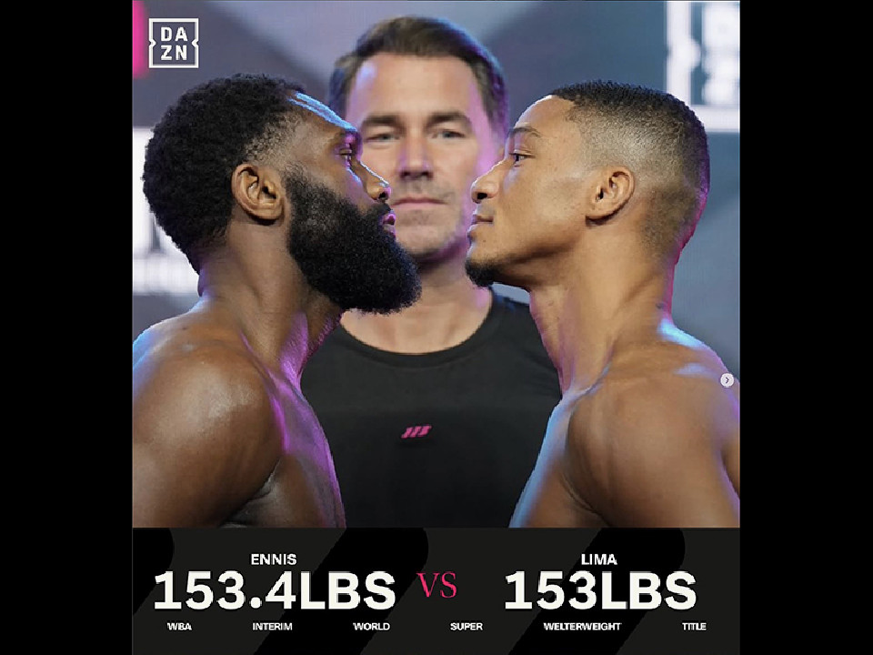 元WBAスーパー・IBF世界ウェルター級統一王者ジャロン・エニス(28=米)がスーパーウェルター級に進出。日本時間12日、米国・ペンシルバニア州フィラデルフィアのウェルズファーゴ・センターで、WBA世界同級暫定王座決定戦に挑む。ベルトを競うWBA世界同級8位ウイスマ・リマ(32=アンゴラ)と日本時間の11日、前日計量の秤の前で対峙した。
