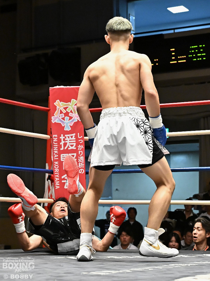 ライト級4回戦では、塩崎優人(19=渡嘉敷)と舞明徳(31=FUNABASHI)が対戦。ジャブの差し合いから始まった試合は、塩崎が右ストレートから左フックを的確に打ち込み、会場を沸かせた。手応えを感じながらも「立ち上がってくると思ったので、びっくりした」と振り返るその一撃が、勝負を決めた。
