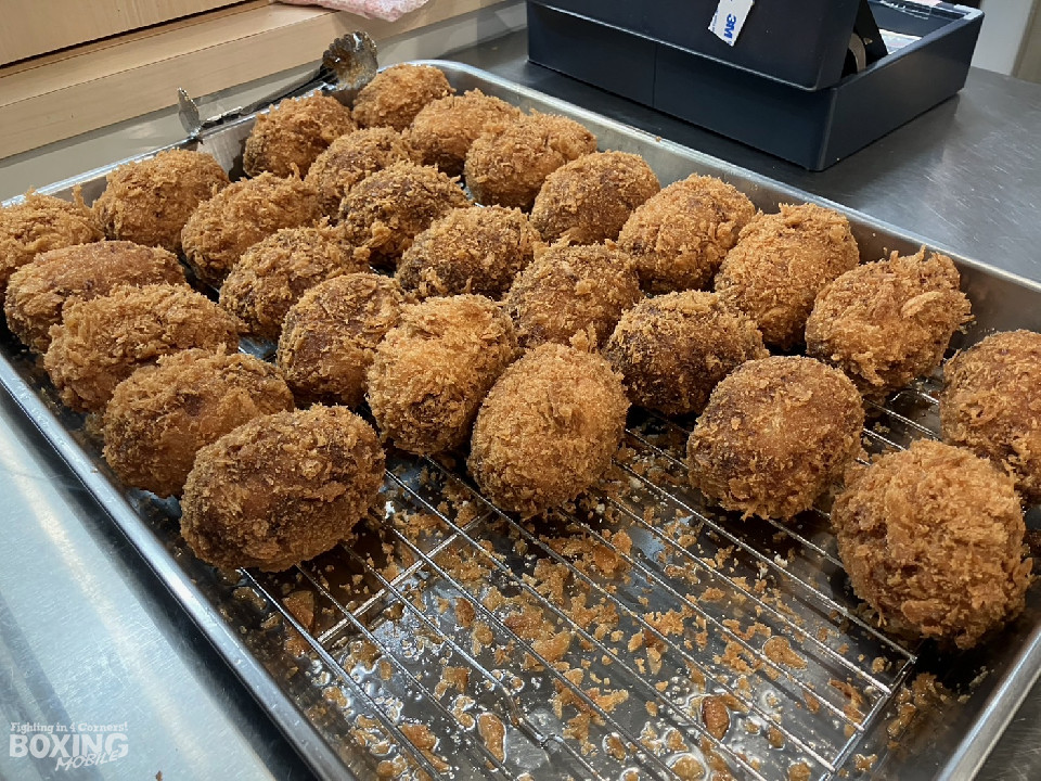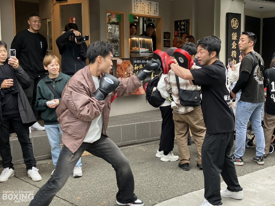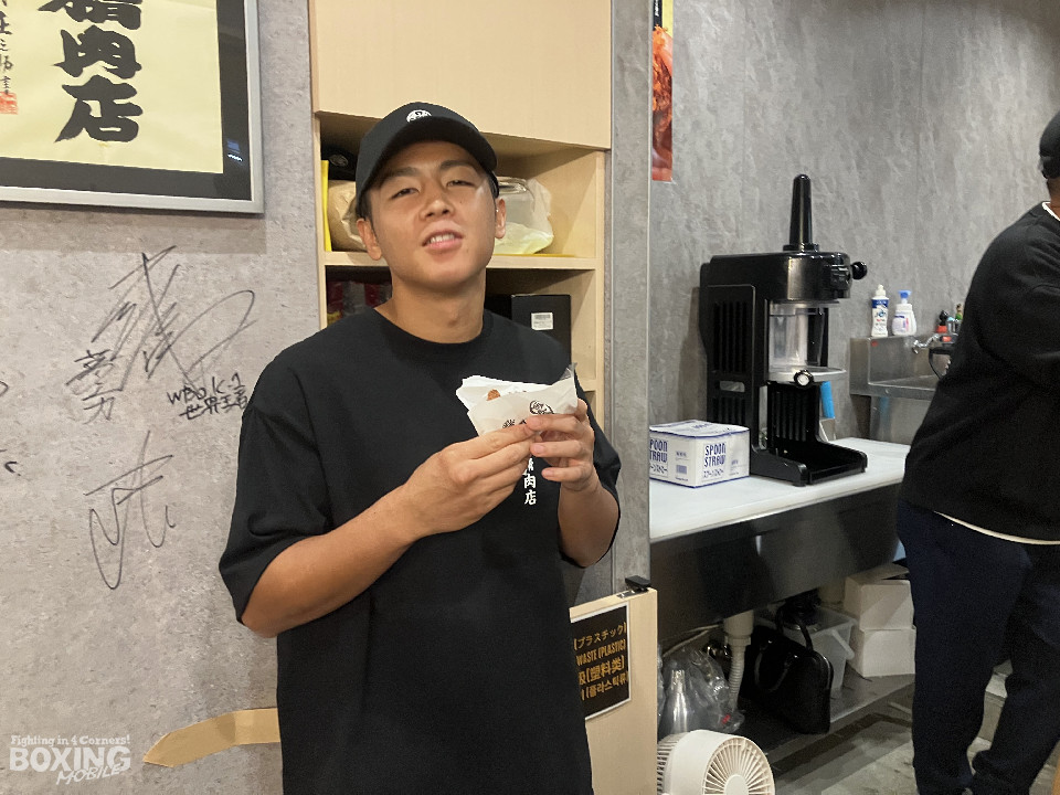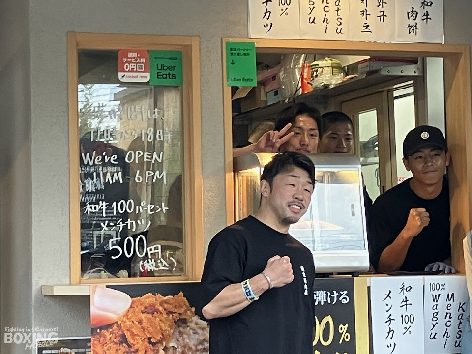 武居は写真撮影や握手に気さくに応じ、ファンとの交流を楽しんだ。中にはこのイベントのために京都から駆けつけ、ミットとグローブを持参して八重樫トレーナーにミット打ちをお願いするファンの姿も。また、武居と握手できたことに感激して、肝心のメンチカツを受け取るのを忘れるファンも現れ、店頭は終始、笑いと歓声に包まれた。