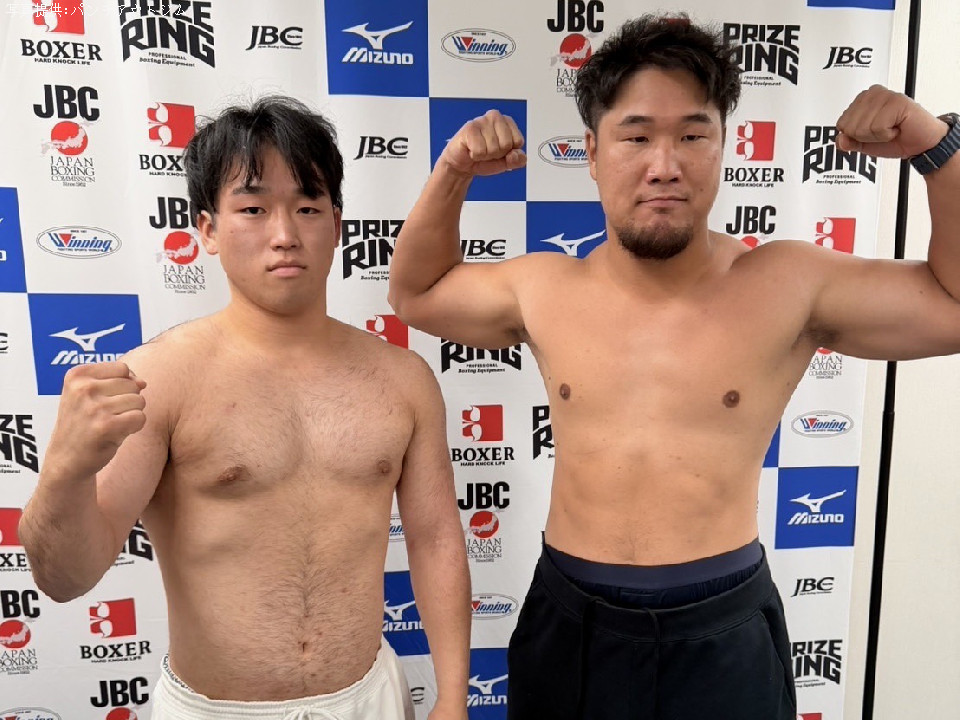 FOD フェニックスバトル145 & DANGANの前日計量が10日、都内の日本ボクシングコミッション(JBC)事務局で行なわれ、メインイベントのヘビー級4回戦に出場する高山秀峰(33=スパイダー根本)と筒井ちび太(22=パンチアウト)が顔を合わせた。