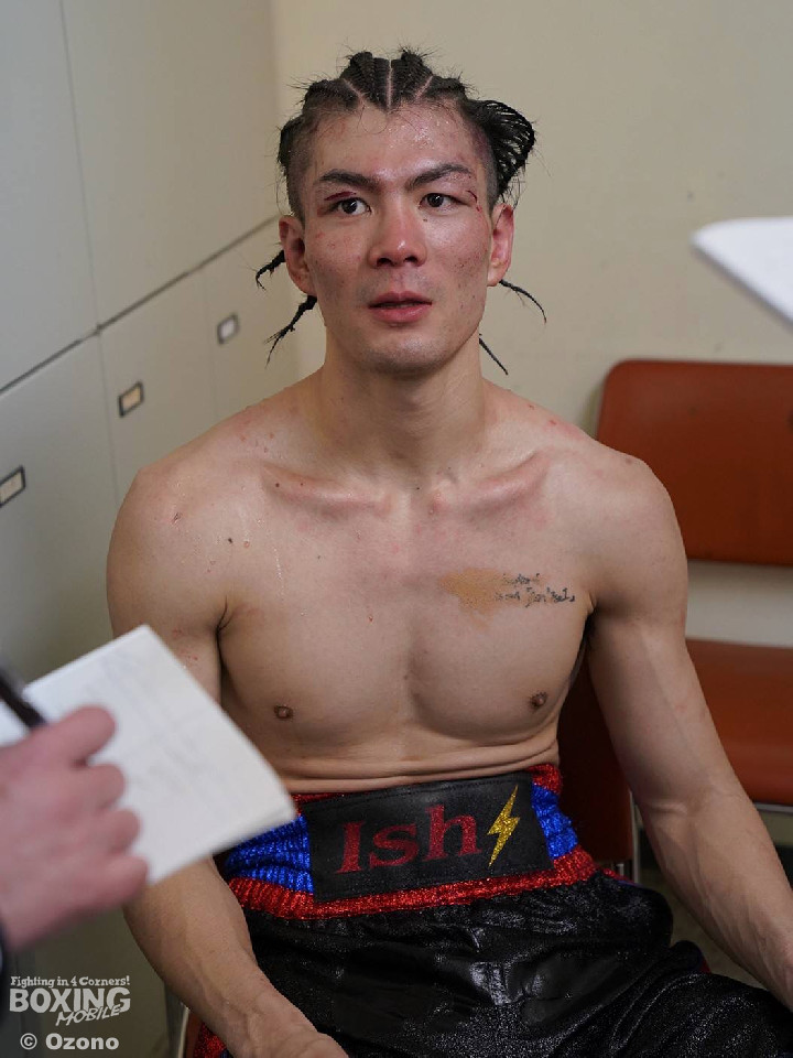 倒しきれた要因を聞くと「トレーナーのおかげ」と言い、隣にいた竹内チーフトレーナーが作戦を教えてくれた。「最初は、オーバーハンドで当てる作戦だったが、ブロッキングされたので作戦を変えた。アオキがオーバー系のパンチを振ると、石脇は必ずダッキングをする。それを見抜いて、オーバーハンドを囮にしてアッパーを打ち込んだ」と裏側を明かした。