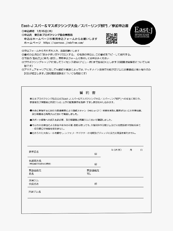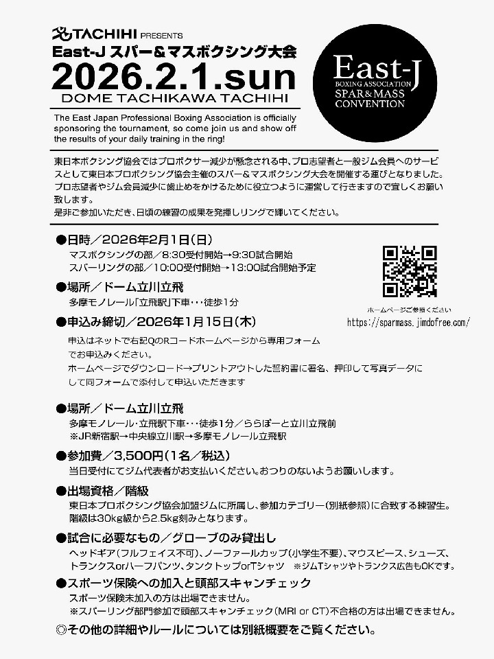 東日本ボクシング協会は、安全で安心なスパーリング・マスボクシング大会を2026年2月1日(日)に開催する。プロ志望のボクサーは公式リング、JBC認定レフェリー、ドクターが揃う本格的な環境でスパーリングに挑戦でき、ボクシング愛好者も緊張感あふれる舞台でマスボクシングを楽しめる。大会は「プロに近い経験を、安全に熱い勝負を」をテーマに、安全面に配慮しつつ熱い試合が体験できる内容になっている。