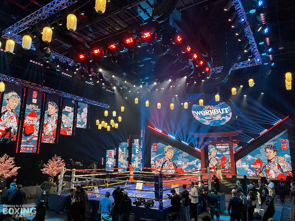 公開練習の舞台となったGlobal Theatre Boulevard City Riyadhは、桜や「和」を基調とした豪華な演出が施された特別な空間。その中で全体の4番目に登場した今永は、軽快なシャドーボクシングを披露した後、報道陣の写真撮影に応じ、落ち着いた表情を見せた。