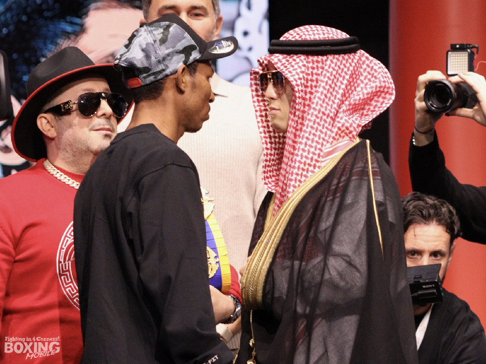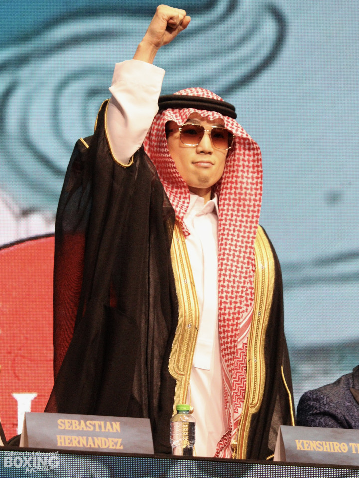 拳四朗は23日に行われたグランドアライバル(選手が現地入りした際に行われる海外の恒例イベント)同様、サウジアラビアの民族衣装で登場。今回は白の長衣に黒の上着を羽織り、「同じでは面白くないでしょ」と柔らかな笑顔を見せつつも、雰囲気は終始引き締まっていた。