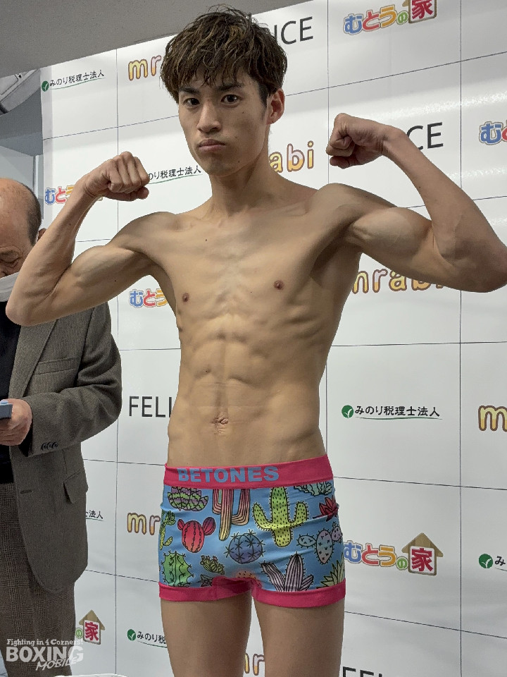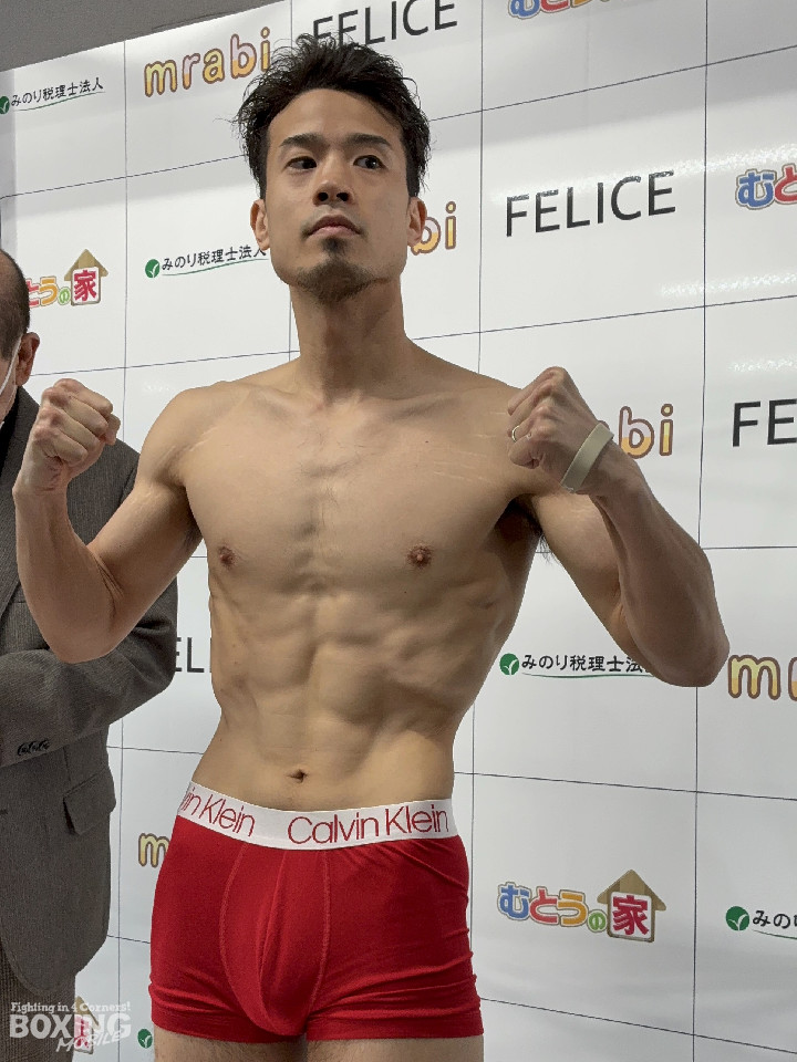 辰吉はリミット55.2sを100g下回る55.1sで一発クリア。引き締まった表情で秤を降りると、「バッチリと仕上がった。相手の印象は特にない。いつも通りKOを狙う」と淡々。痛めていた拳も完治し、コンディションは万全だ。
