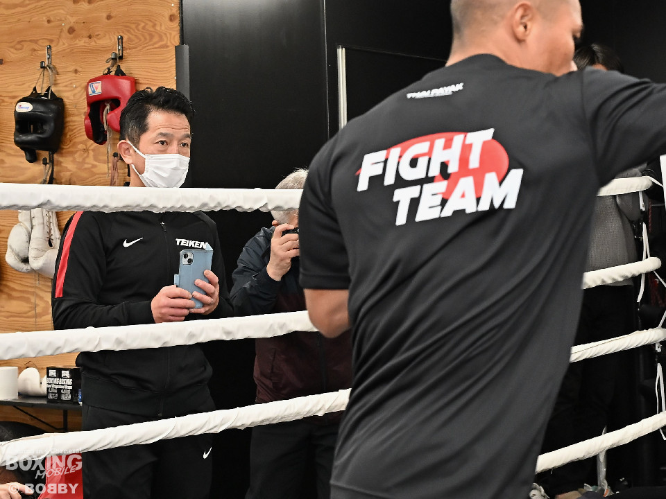 囲み取材に応じた田中トレーナーは「スピードがあるわけではないが、これだけ世界戦を勝っているのだから、対峙した時にやりづらい何かを持っているのだろうと思う。それを確かめに来たが、軽めの練習だったので分からなかった。もっと小さいと思っていたが、思っていたほどではなかった。ただ、ミニマム級の選手だなと思った」と率直な印象を語った。