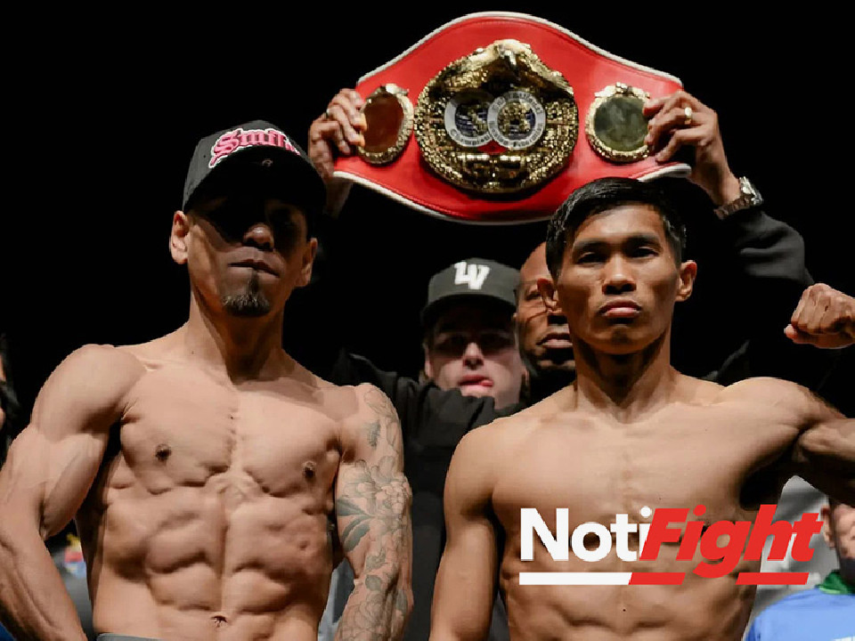 ミニマム級リミット47.6kgを王者タジュラン200g少ない47.4kgでクリア、挑戦者ペレスは400gアンダーの47.2kgで秤を降りた。