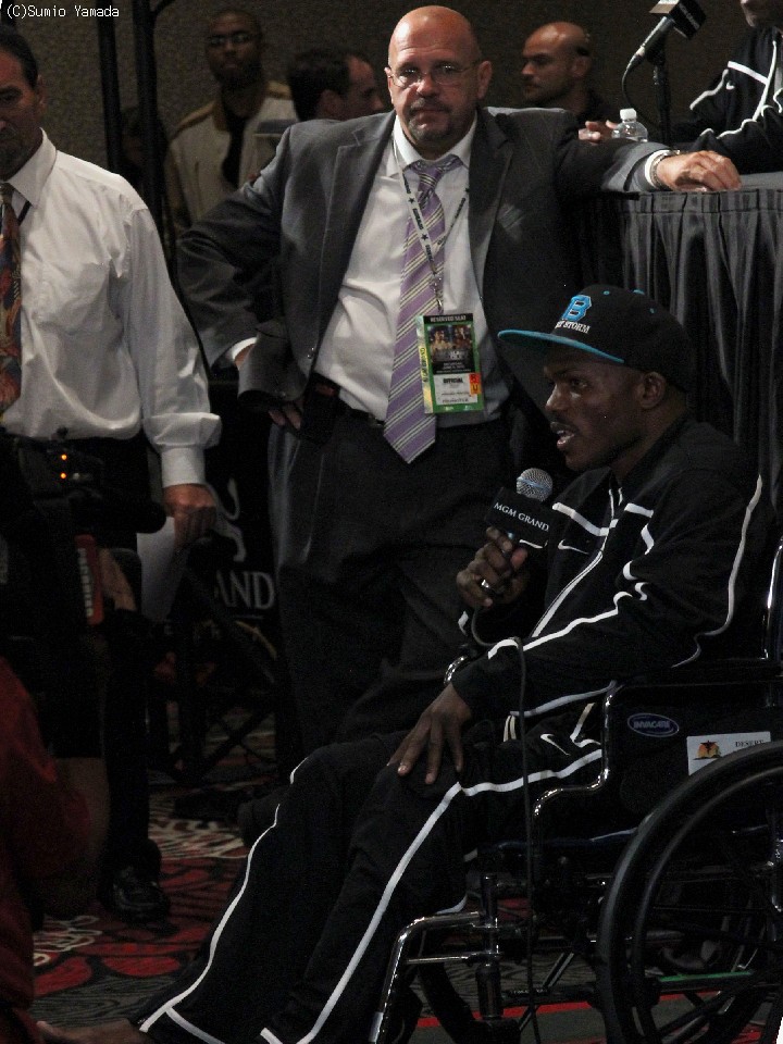 そして新WBO世界ウェルター級王者となったブラッドリーが、2ラウンドで足首を痛め、骨折の疑いがあるということで車いすに乗って登場した。「パッキャオはウォリアー(戦士)だった。パンチ、スピード、すべてを持っている」と対戦相手に対し敬意を払った。記者から判定について聞かれると「ジャッジが3人いてこのような結果になった。それ以上のことは言えないよ」と答えた。