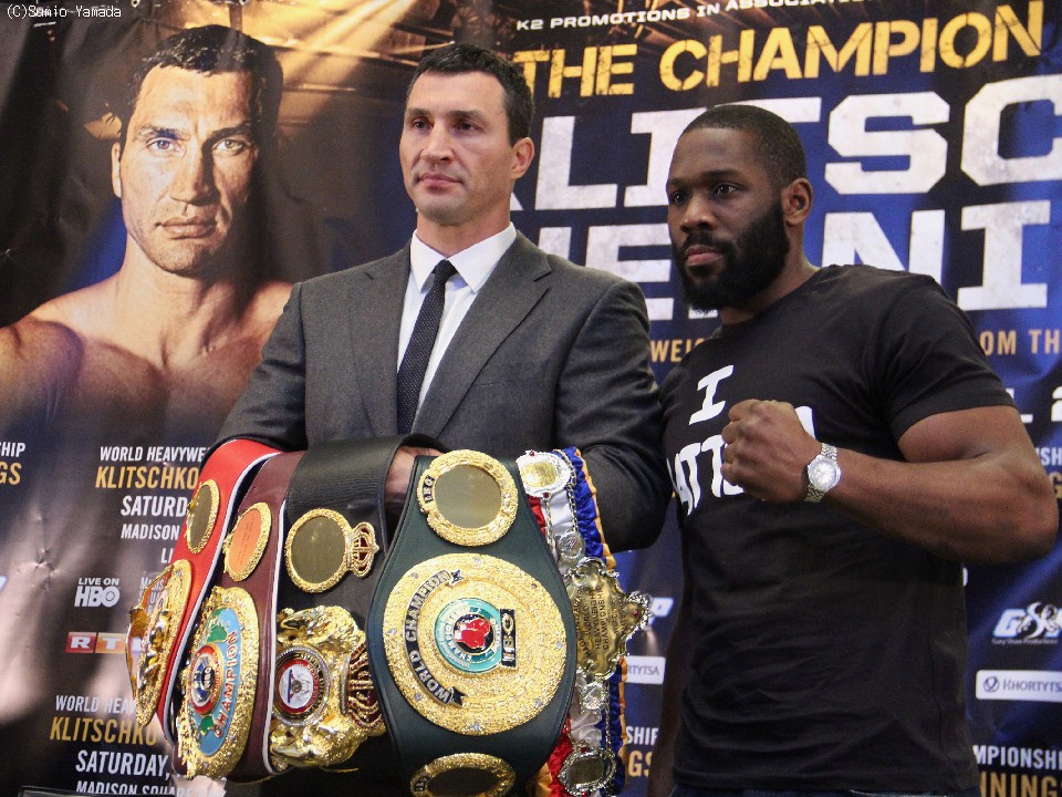 WBA、IBF、WBO3団体統一世界ヘビー級王者ウラジミール・クリチコ(38=ウクライナ)が4日、4月25日に米国ニューヨークのマジソン・スクエア・ガーデン(MSG)で行われるブライアント・ジェニングス(30=米)との防衛戦を前に挑戦者と一緒に会見に臨んだ。