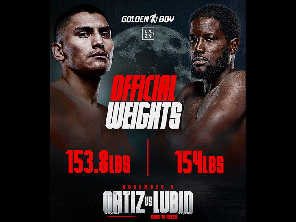 スーパーウェルター級のリミット69.8kgに対し、オルティスは100g少ない69.7kgでクリア。対するルービンもリミットちょうどの69.8kgでパスし、両者ともに問題なく計量を終えた。