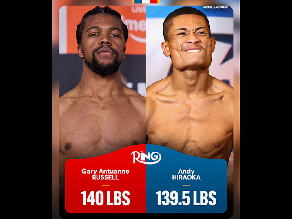 王者ラッセルはスーパーライト級リミット63.5kgでクリアすると、対する挑戦者の平岡も300g少ない63.2kgでパスした。