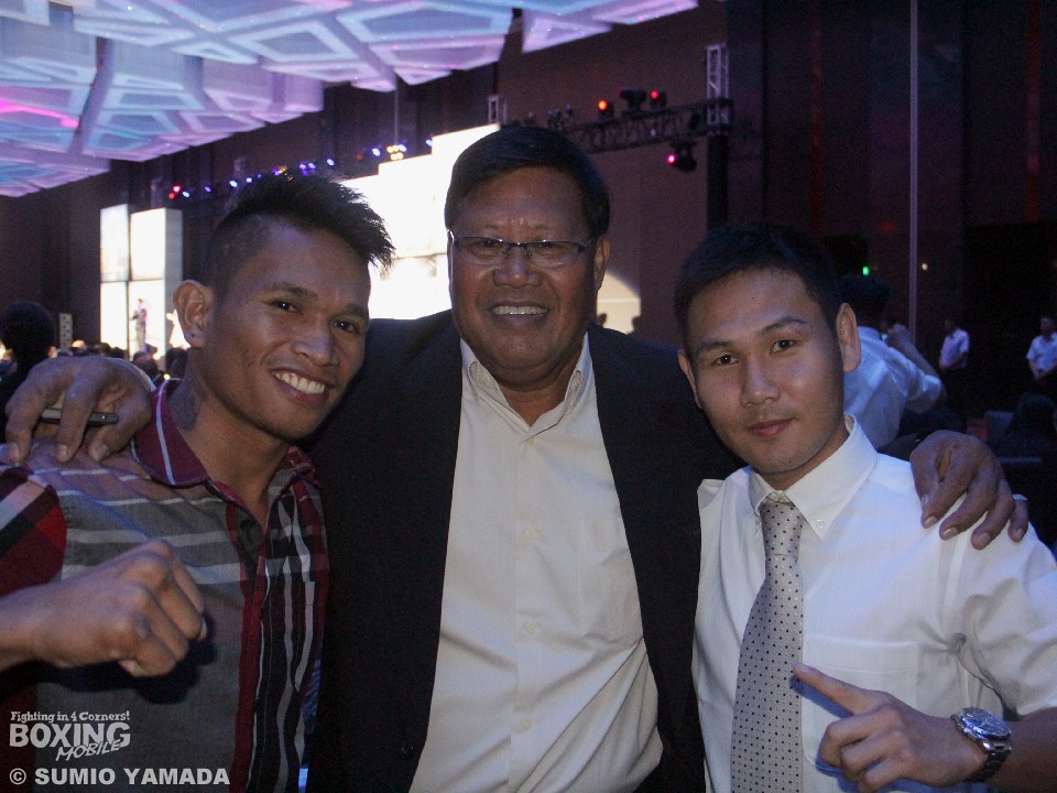 前夜にアムナットから王座を奪取した新王者カシメロも祝福。出席した高山勝成、サミー・ヘロプロモーターと撮影。