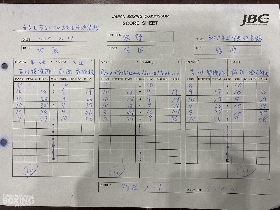 日本女子ミニマム級王座決定戦が27日、神戸市立中央体育館で開催された「REAL SPIRITS vol.91」のセミファイナルで行われ、同級1位の吉川梨優那(23=泉北)と同級2位の前原香那枝(35=三迫)が第8代チャンピオンの座を争った。