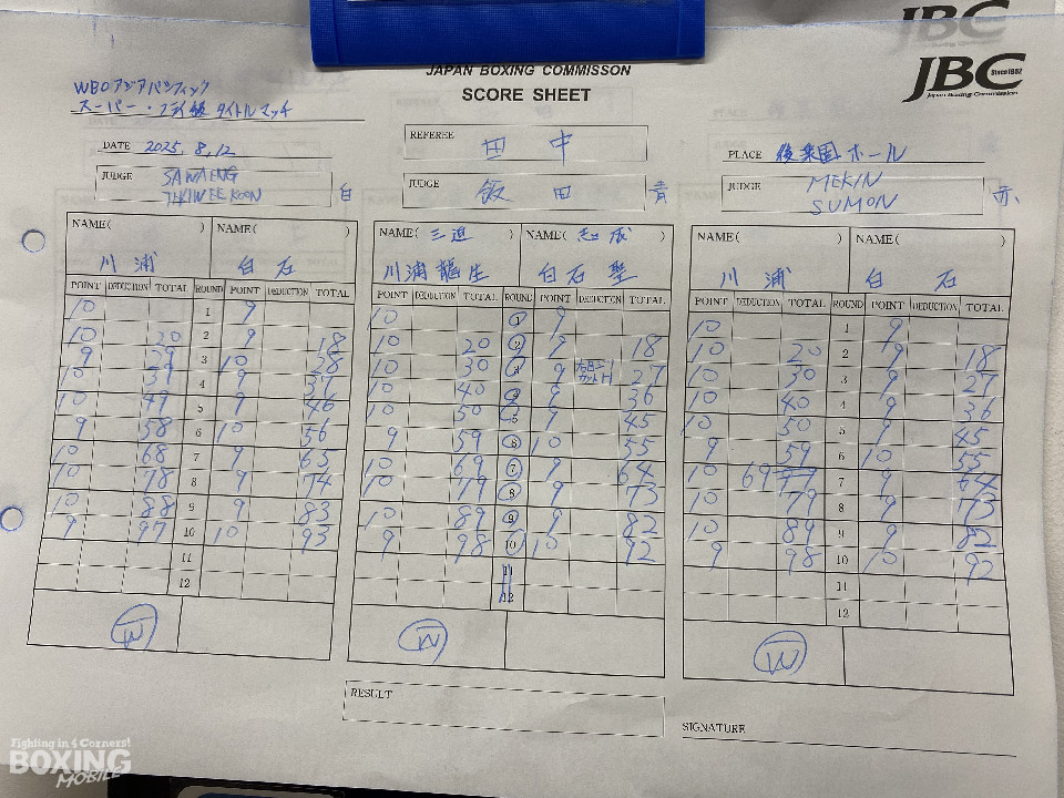 初回は、サウスポー川浦が左ストレートで先制。2回、白石は右ストレートと左フックで反撃したが、3回以降は、川浦が積極的にプレッシャーをかけて、左カウンター、左アッパーを決めてポイントを連取した。なかなか攻めきれず失点した白石は、最終10回に猛反撃したが、川浦はクリンチで上手くエスケープした。試合運びの上手さを見せた川浦が王座防衛に成功した。