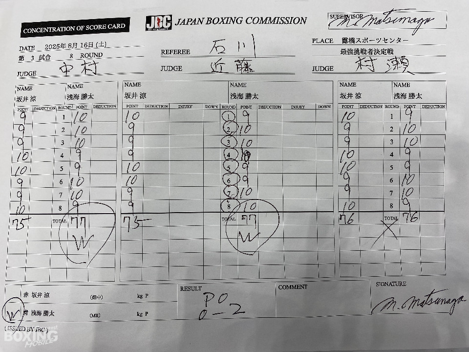 浅海が細かくジャブを突きながら、緩急を意識したコンビネーションで見栄えの良さをアピール。4〜5回、坂井はジャブを軸に盛り返したが、6回〜7回は浅海がボディにパンチを集めて攻勢。最終8回は坂井はワンツー左ボディを好打した。ジャッジ2者の支持を得た浅海が挑戦権を獲得した。