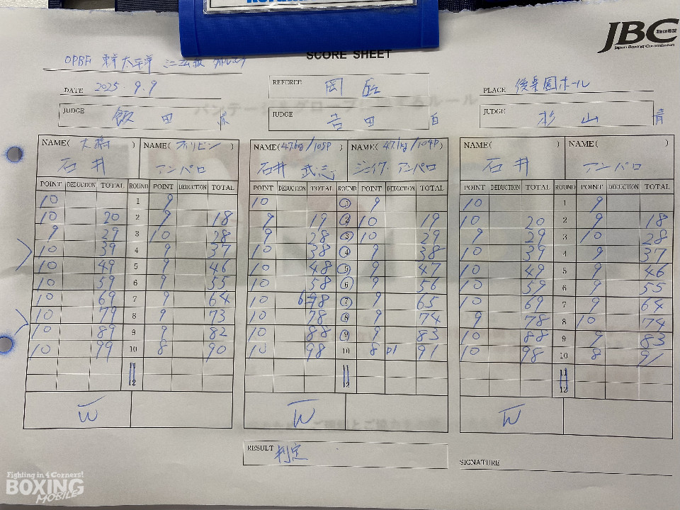 序盤から石井が距離を詰めて、左ボディを叩きつけて先制攻撃。アンパロはジャブを突いて突き放しにかかるが、石井はプレスをかけて積極的に攻めた。4回と8回の公開採点でリードした石井は、最終10回に左ボディでダウンを奪い、勝利を確実なものとした。